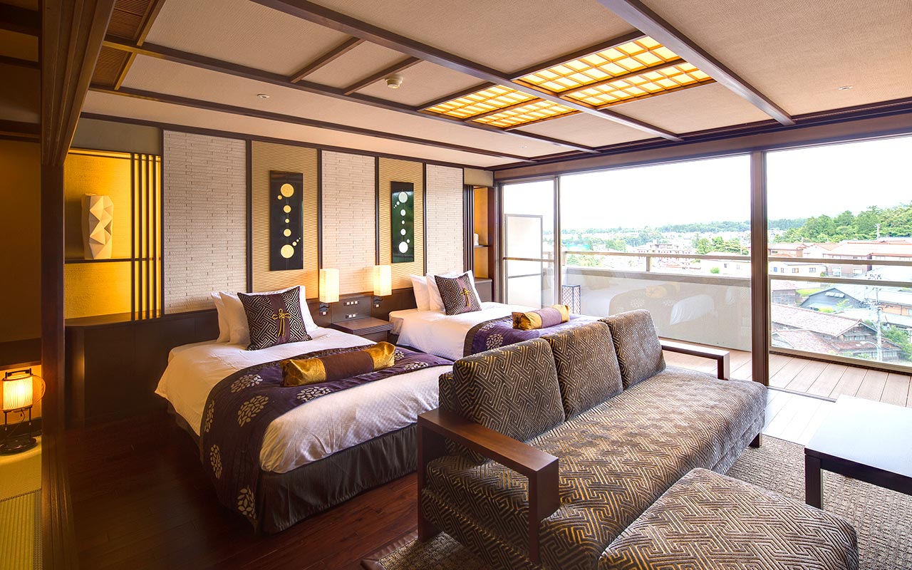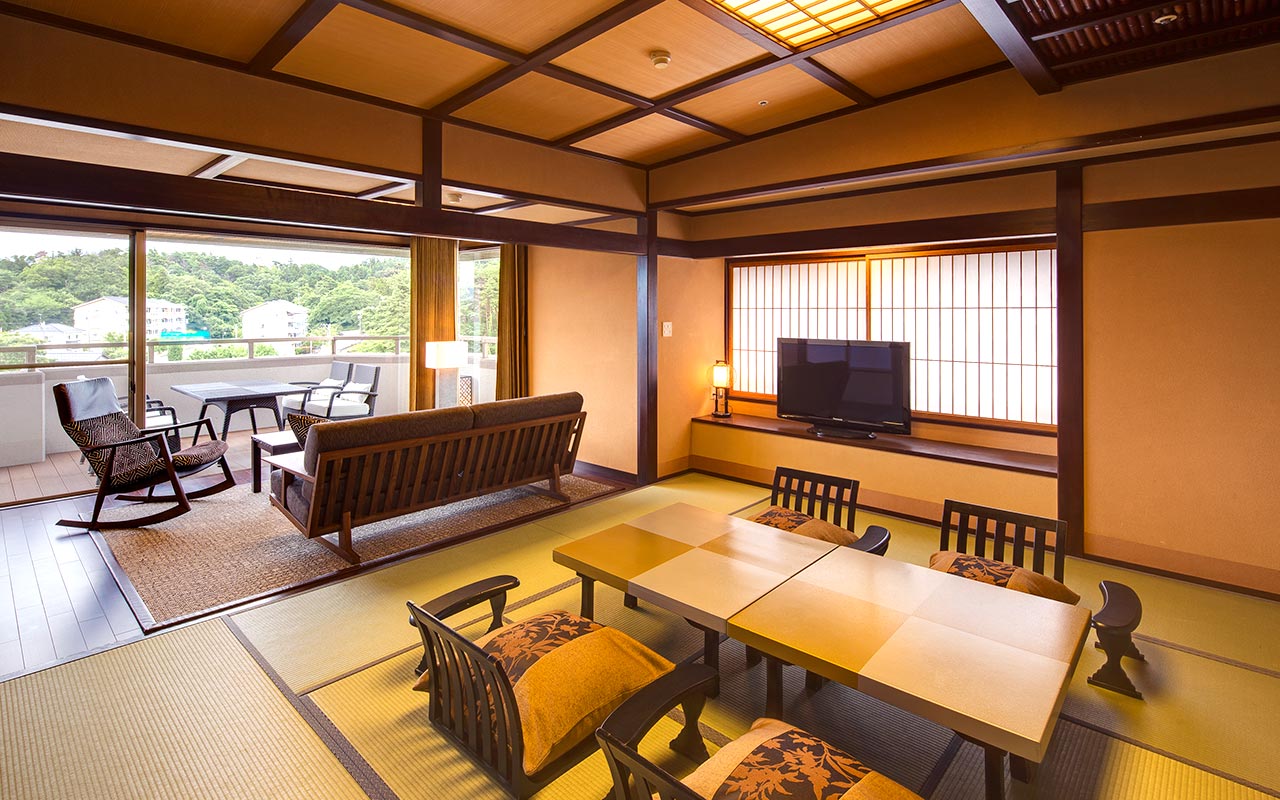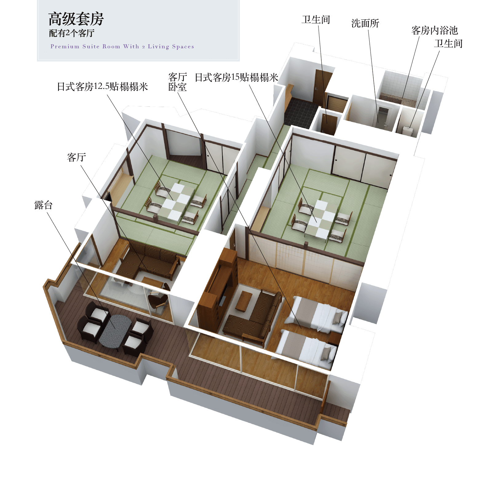 客房 天祥馆 尽享升级版的贴心款待 白云馆 为您准备了支持多种需求的特色房间 西式客房 仿佛置身酒店的舒适空间 天祥馆 高级套房 配有2个客厅 配有2个客厅、卧室和露台休闲区的高级套房 日西合璧客房/高级套房(660号房) 高级套房 配有2个客厅 高级套房 配有2个客厅 高级套房 配有2个客厅 高级套房 配有2个客厅 高级套房 配有2个客厅 高级套房 配有2个客厅 客房内浴池 高级套房内除2个日式客房(15贴榻榻米/12.5贴榻榻米)以外,还有2个配有沙发的客厅、卧室(双人间)和露台休闲区。 房间布局 2个日式客房、2个客厅、卧室(床由席梦思公司生产)、客房内浴池、露台、2个洗面池、2个卫生间 用品和设备 冰箱/保险箱(免费提供)/牙刷/浴巾/小毛巾/吹风机/浴衣/洗发露护发素/沐浴露/BOSE公司生产的CD播放器/空气净化器 客房面积 约121平方米 露台约16平方米 Wi-Fi可免费使用。 房间内禁烟(室外露台允许吸烟)。