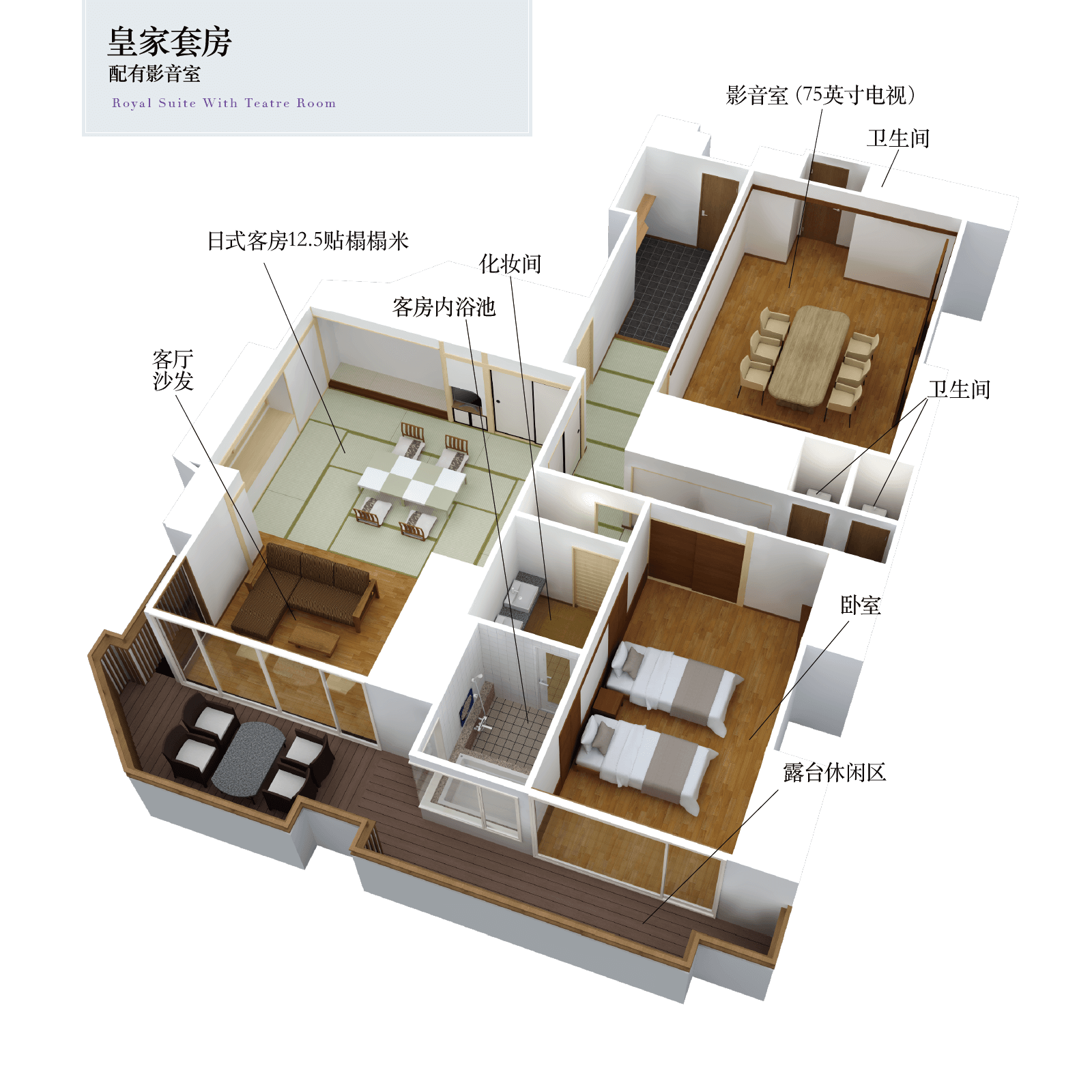 房间布局 日式客房、客厅、卧室(床由席梦思公司生产)、影音室、客房内浴池、露台、2个洗面池、3个卫生间