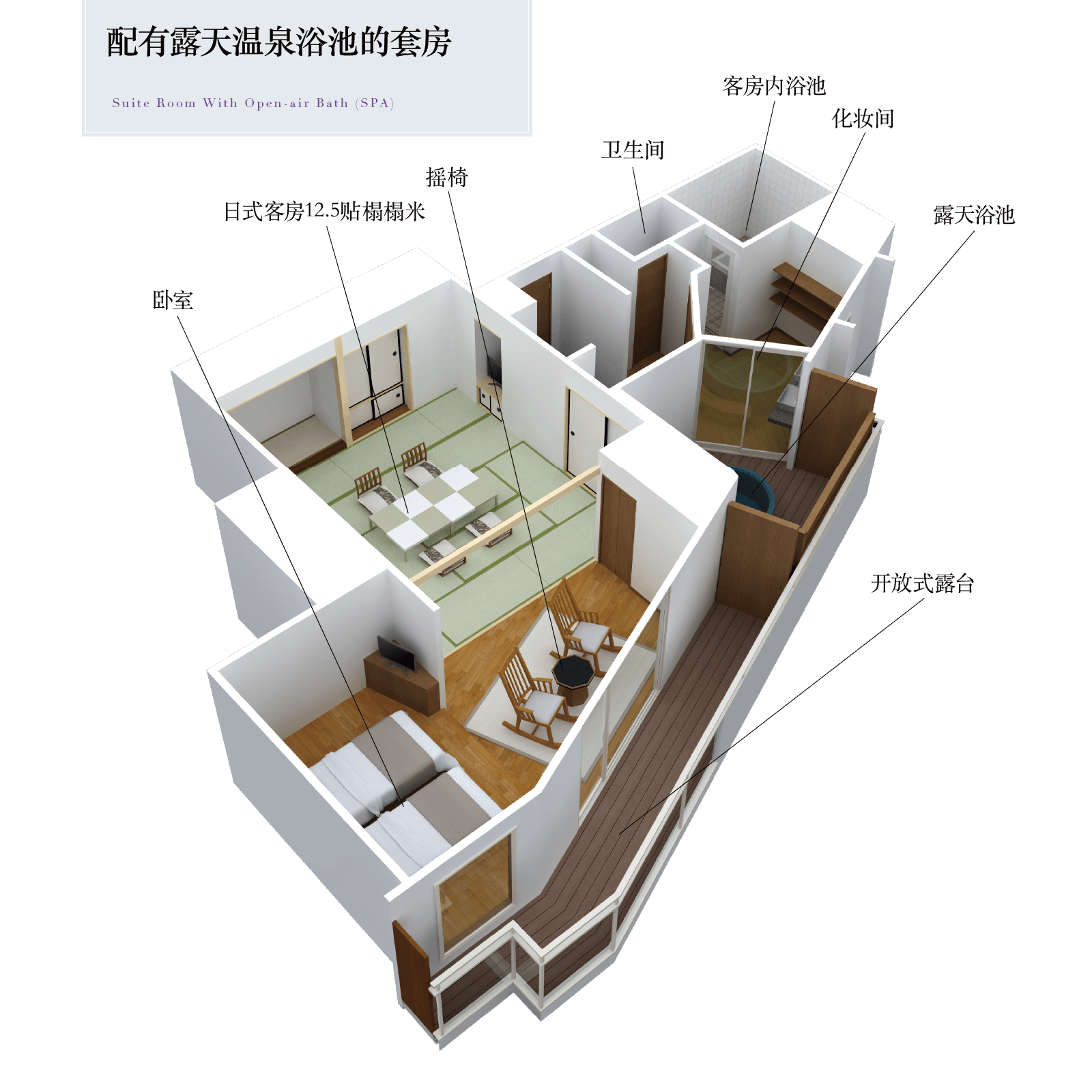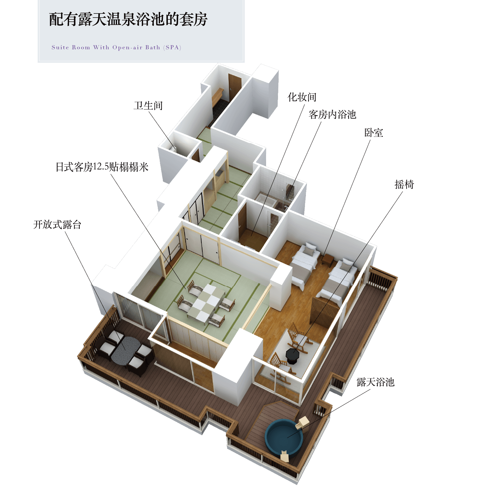 | 房间布局 | 日式客房、卧室(床由席梦思公司生产)、露天浴池、客房内浴池、露台、2个洗面池、1个卫生间 |