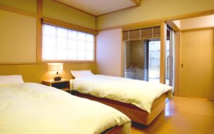 객실은 양실 트윈의 아담한 15㎡의 룸이지만 노천 온천탕을 프라이빗하게 즐기고 싶은 분께 권합니다.