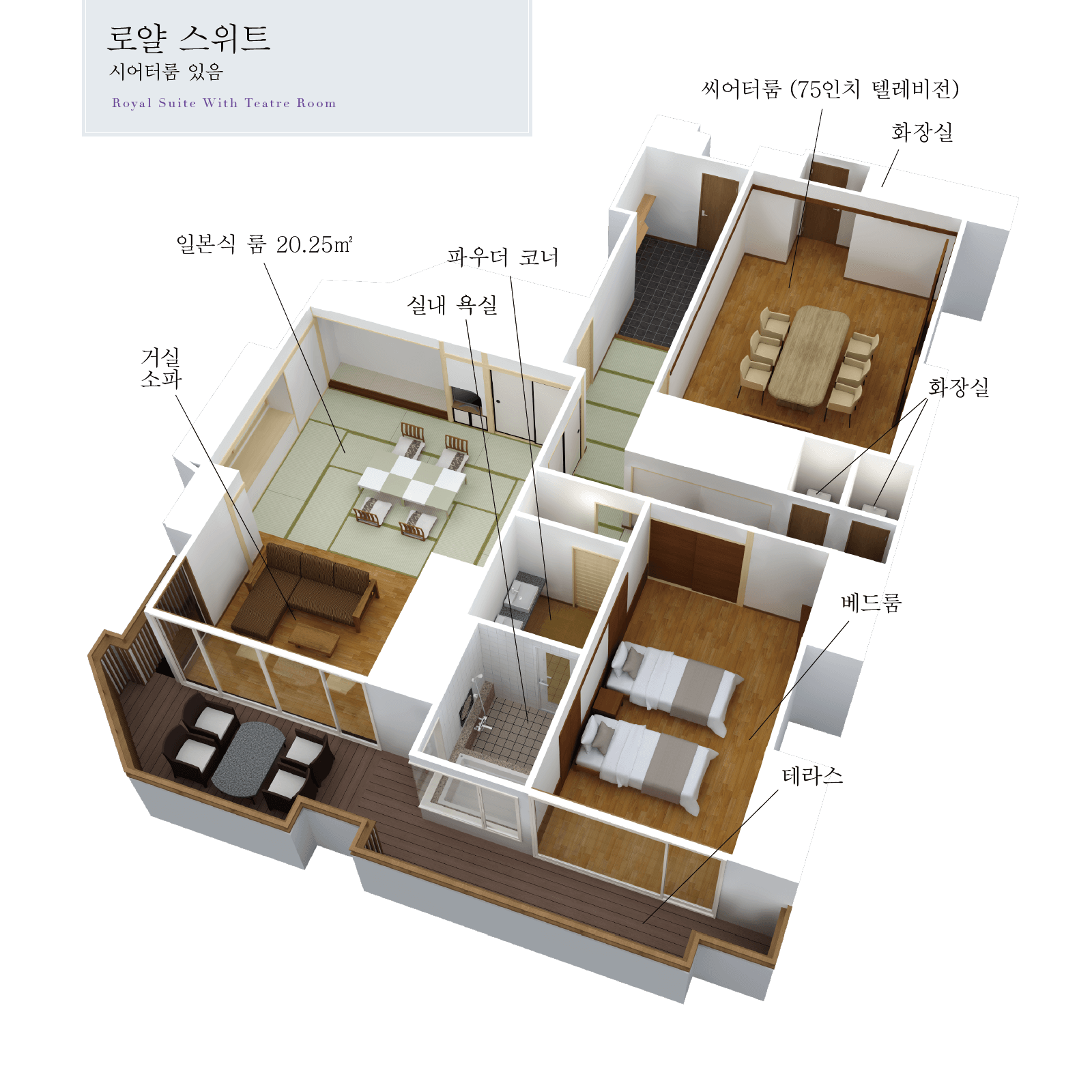 | 객실 구조 | 일본식 룸, 거실, 베드룸 (시몬스사 제품), 씨어터룸, 실내 욕실, 데크테라스, 씽크대 2개, 화장실 3개 |