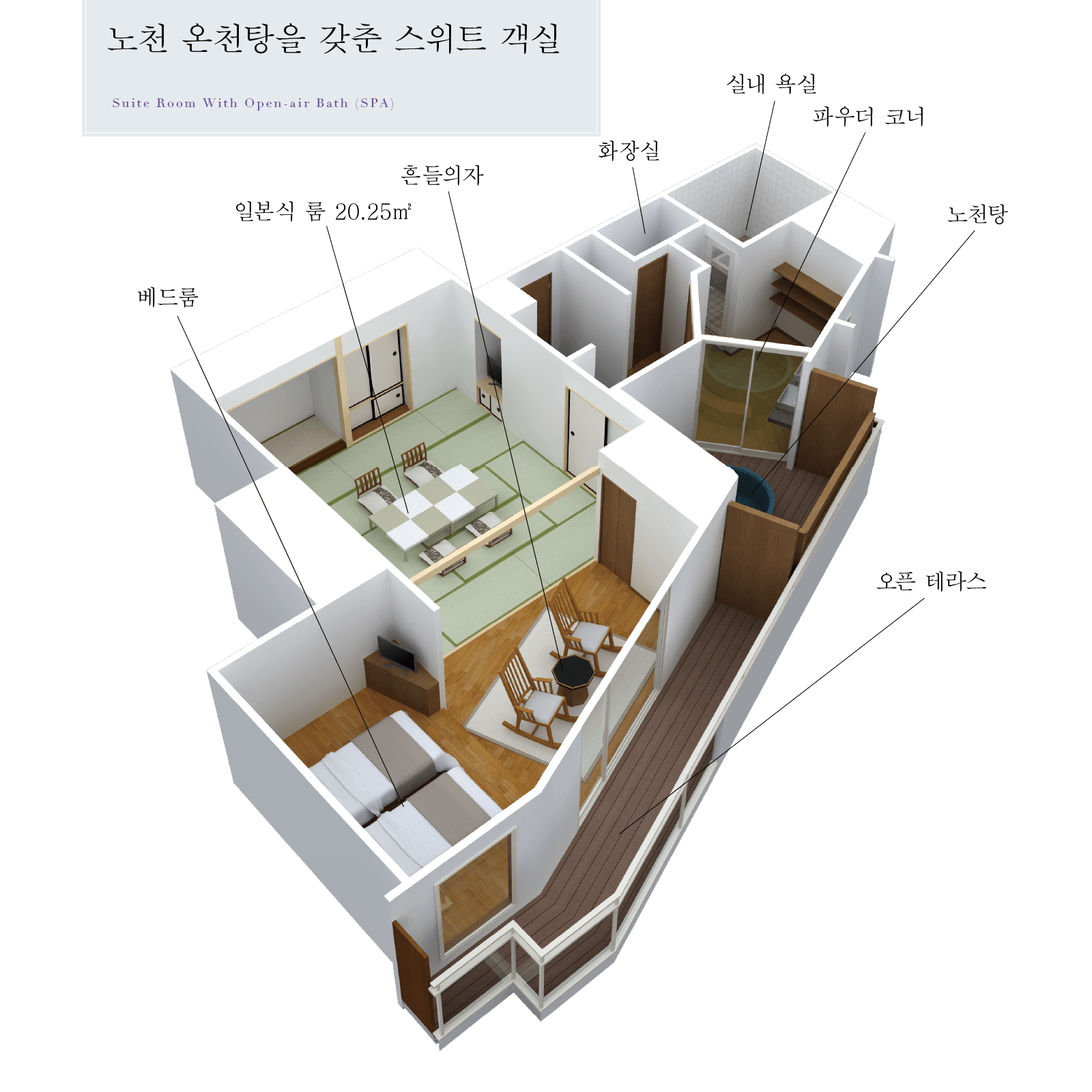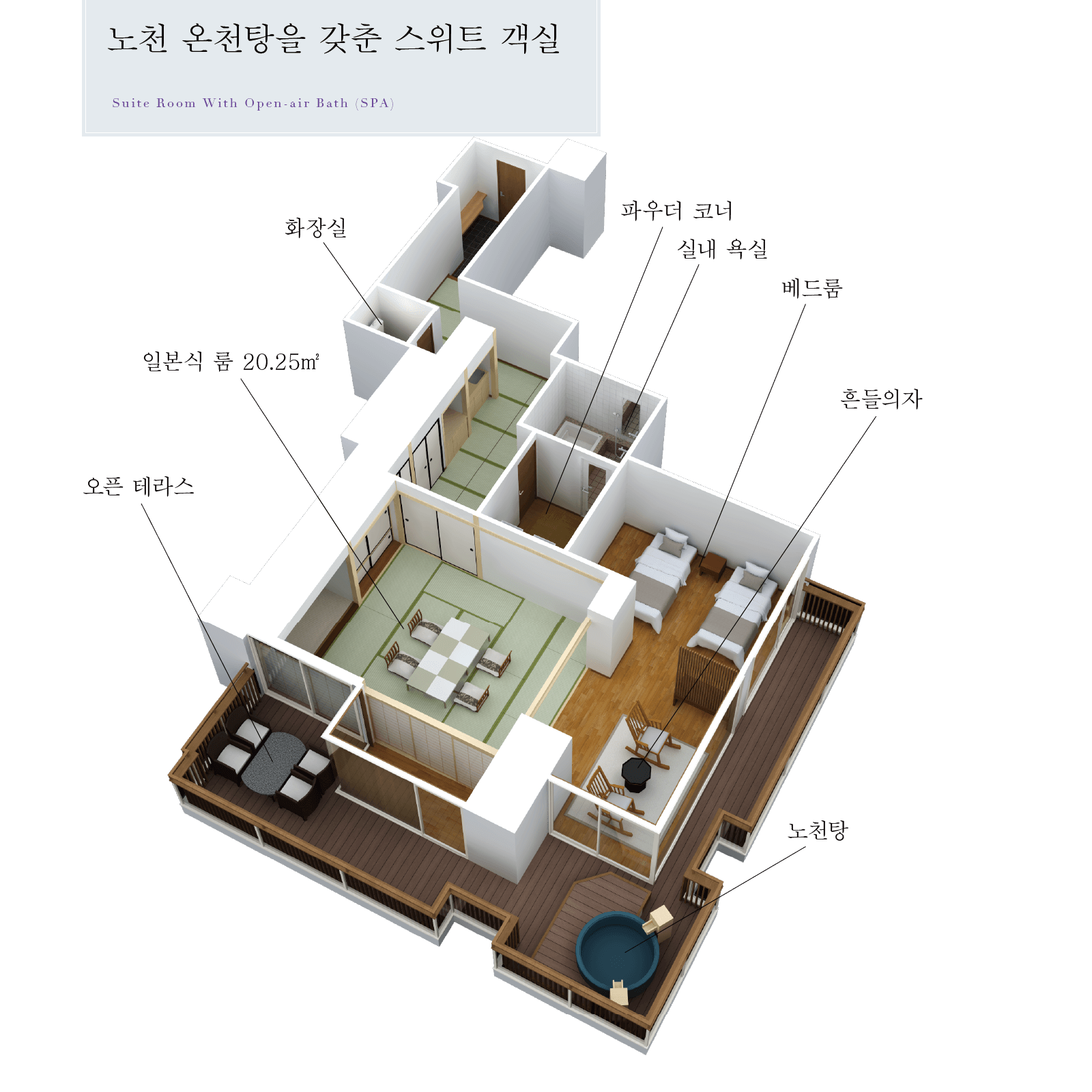 | 객실 구조 | 일본식 룸, 베드룸 (시몬스사 제품), 노천탕, 실내 욕실, 데크테라스, 씽크대 2개, 화장실 1개 |