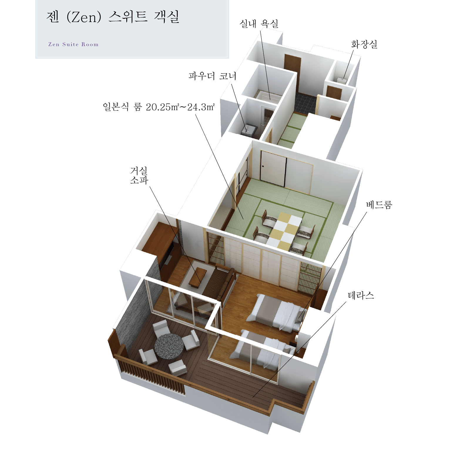 - 일본식 룸20.25㎡/24.3㎡/29.16㎡+트윈베드+거실+살롱 드 테라스.